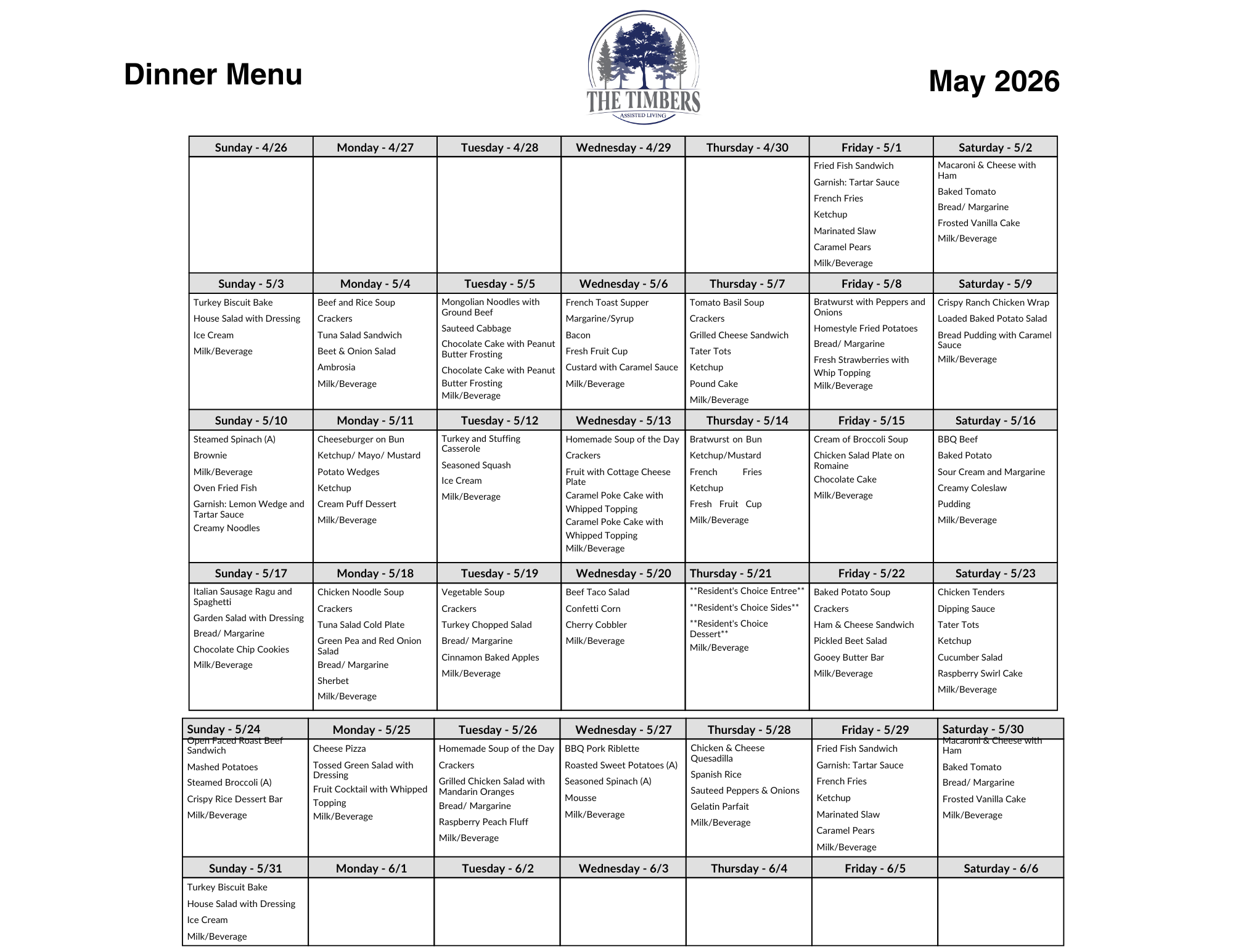 With a flexible ala carte menu that changes regularly, The Timbers provides residents with a delightful and enjoyable dining experience every day. Registered Dietitians work with our professional dietary and nursing team to guide assisted living menus, support optimal nutrition, and provide education for residents, families, and staff.